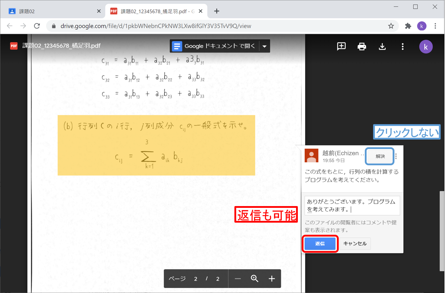 Google Workspace ドキュメントやスプレッドシートで作成したレポートにも,手書きコメントが記入されていることがあります。 提出したファイルとは別に,ファイル名の先頭に 「編集済み -」 と付いたファイル (PDF) が添付されていれば,これをクリックします。