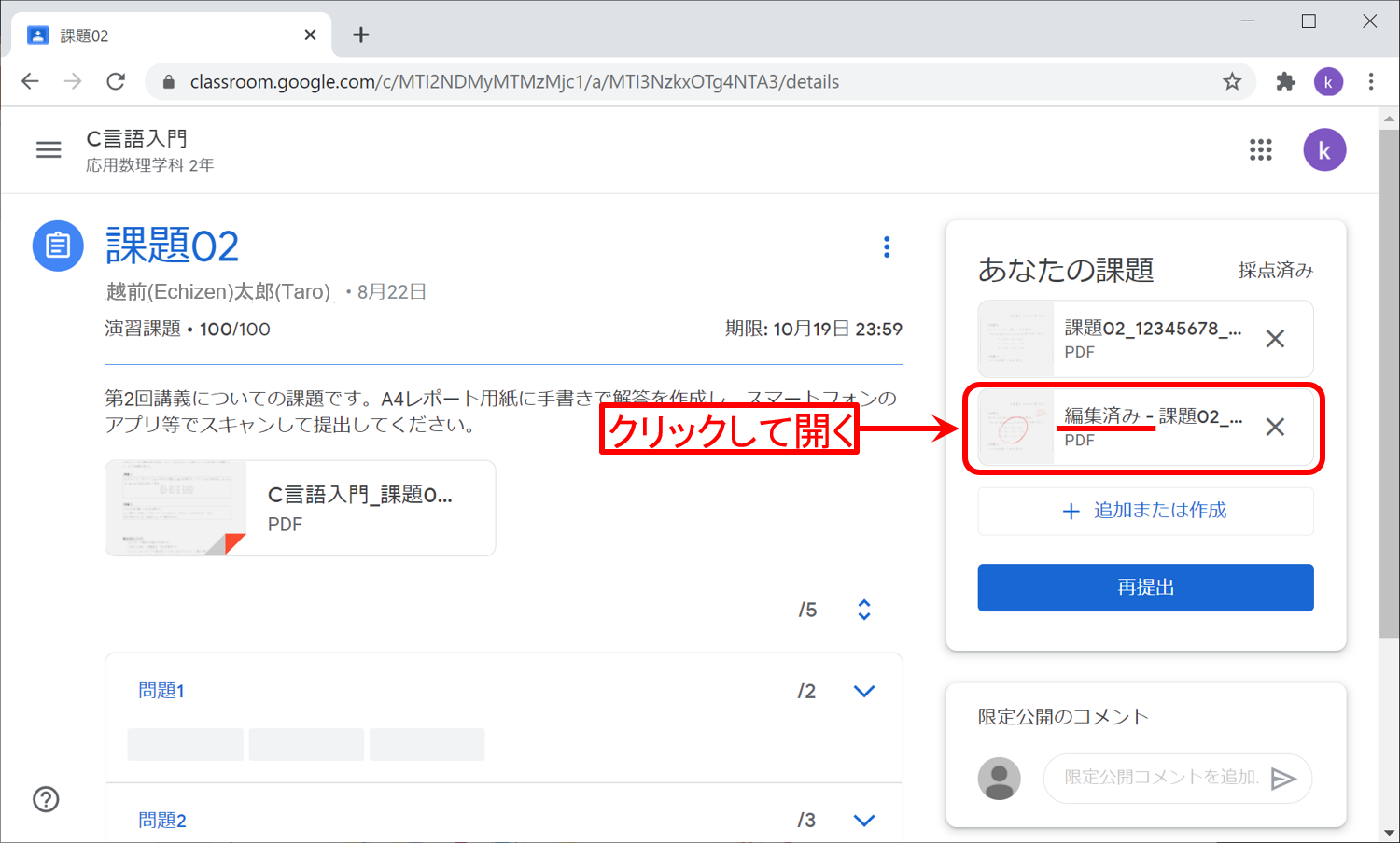 手書きレポートの場合,タブレット等を使って手書きでコメントが記入されていることがあります。 提出したファイルとは別に,ファイル名の先頭に 「編集済み -」 と付いた PDF ファイルが添付されています。 これをクリックして開きます。