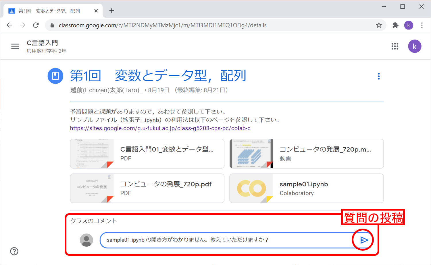 資料について質問がある場合は,[クラスのコメント] から投稿できます。 このコメントは,クラスメート全員が見ることができます。